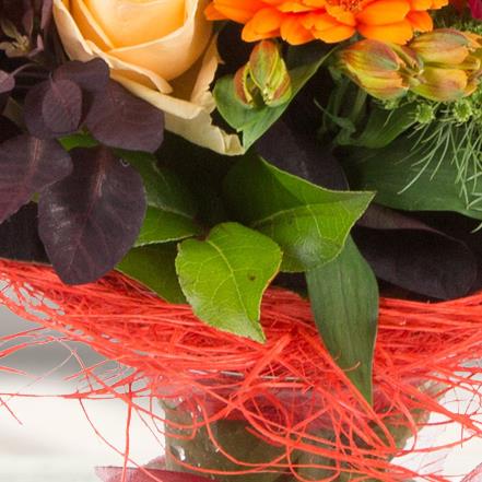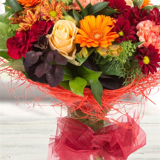 A delightful, compact bouquet of autumnal orange, red, and rust flowers in a sisal wrap presented in a glass vase.